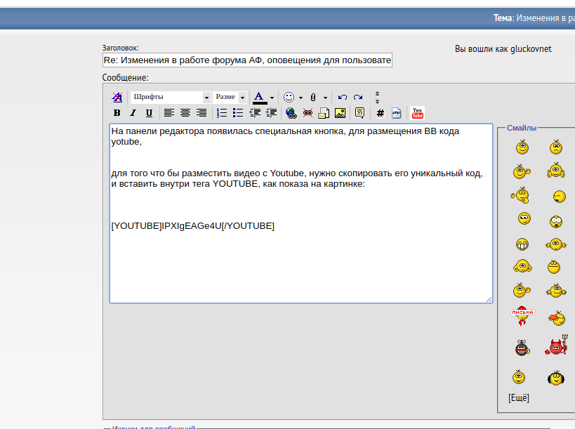 На панели редактора появилась специальная кнопка, для размещения BB кода yotube, для того что бы разместить видео с Youtube, нужно скопировать его уникальный код (например это IPXIgEAGe4U), и вставить внутри тега YOUTUBE, как показано на изображении вложения к этому посту. Видео в итоге будет выглядеть так: |
