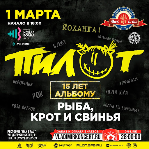 1 марта "Пилот" отыграет во Владимире уникальный концерт, посвященный 15-летию культового альбома "Рыба, Крот и Свинья"! В концертный сет-лист войдут все песни с легендарной пластинки и главные хиты группы.