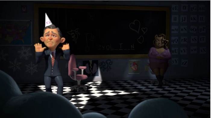 После того, как танец закончился, он садится на стул и начинает стыдить зрителя (девушка с яблоком). Сцена – отображение ситуации с Бушем, когда он сидел в классе и читал сборник «Мой домашний козел». Показана классная комната, президент сидит в похожем положении на стуле, и учительница немного напоминает ту, из видео (полная, темнокожая женщина).