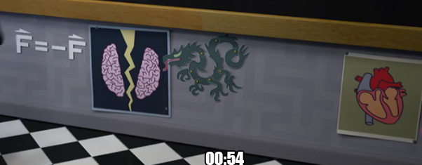 Наш клоун выплясывает на черно-белом полу, напоминающим шахматную доску (известный масонский символ), причем свет падает именно в форме пятиконечной звезды (опять символ масонов). Приглядитесь, куда указывает один из лучей? Под доской изображение человеческого мозга, рассеченное молнией. С правой же стороны стоит, вторгаясь в зону человеческого мозга (между полушариями существует отдел мозга, называемый рептильным), дракон-рептилия.