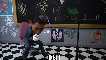 Затем мы видим президента Буша «The Dunce» (имя, данное авторами, очевидно, это его прозвище, балбес что ли), который демонстрирует еще один сакральный жест от Иллюминатов – «коза». Происходит определенный ритуал, Буш вращает головой, подразумевая выборы, то есть ротацию (rotation - вращение) власти, и Буш трансформируется в президента Обаму, очаровательного и интеллектуального, с атрибутом знания на голове и в белых перчатках, которые являются атрибутом масона высокого ранга. Но, как и вся элита, он тоже управляем извне. Человечество подготовлено, первый этап пройден, теперь нужен мудрый и харизматичный политик. Они вывели на сцену никому неизвестного Обаму.