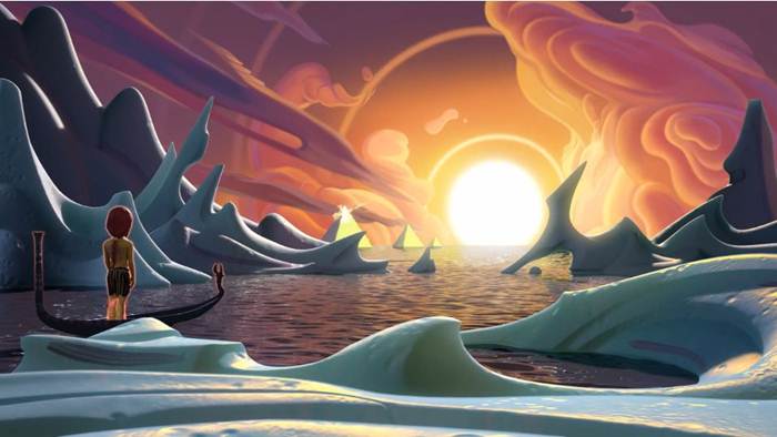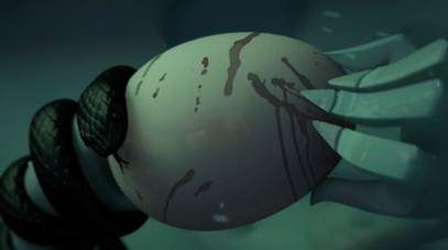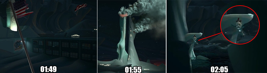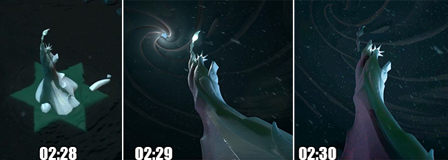 Ладья вплывает в два овала напоминающих срез-проекцию человеческого мозга. Символ яйца, которое обвивает змея, называется Орфическим яйцом, которое у древних греков было символом возрождения. Значение этого, скорее всего - начало полного изменения сознания человечества, пробуждения сознания Христа в людях. Действие в начале ролика происходит зимней ночью, но она заканчивается (окончание Ночи Сварога или Кали-Юги). Начинается полное разрушение старого сознания. Символы разрушения - падающие глыбы, похожие на лед. Сознание-лед, полностью замороженное сознание. Старое сознание, сознание без движения, мертвое сознание.