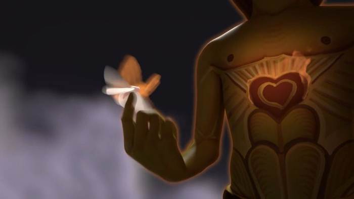 Следующим кадром появляется барельеф египетского божества Анубиса, расположенного на носовой части ладьи. В самой ладье присутствует человек, стоящий с закрытыми глазами, очень похожий на канонического Иисуса Христа с горящим сердцем в центре груди. Его сердце пылает огненным ореолом, а тело как будто из золота. Тем не менее, он носит корону из колючей проволоки (терновый венец). Его глаза закрыты, а тело находится в постоянном движении. Это может означать, что он находится в глубоком трансе и медитирует.