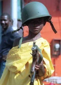 Далее мы видим маленькую африканскую девочку, вооруженную АК-47, и она смотрит на нас своими красными глазами, похожими на глаза робота. Человек, сидящий рядом, снимает с нее пурпурную ленту, символизируя то, что он желает заняться с ней сексом. Я думаю, что красные глаза означают, что африканские дети запрограммированы только на войну, секс и наркотики и ничего больше. В волосах у бойца сердечко - использование детской любви в корыстных целях войны.