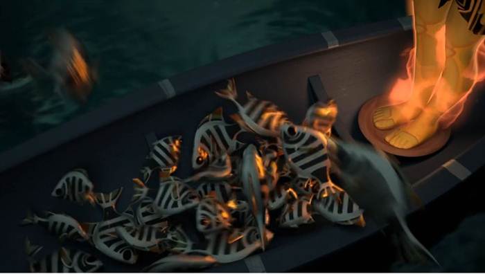 Снова смена кадра. Ладья наполняется рыбой, символизирующая спасенные или избранные человеческие души (рыба - символ раннего христианства до креста). Причем рыба запрыгивает сама, что символизирует свободный выбор и избрание своего пути без внешнего давления.